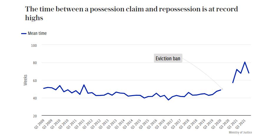 同一时间内,房东计划收回财产到成功驱逐租客之间的平均时间为68周,创下历史新高,即使不包括疫情特殊时期,等待时间也比2019年底高出56%。因为等待时间较长,这会给房东造成进一步损失。