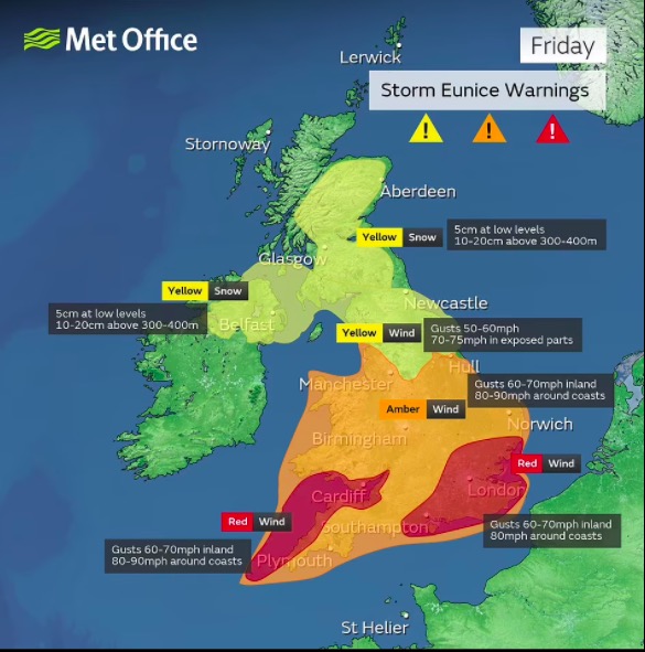 伦敦为风暴尤妮斯(Storm Eunice)发布红色预警: