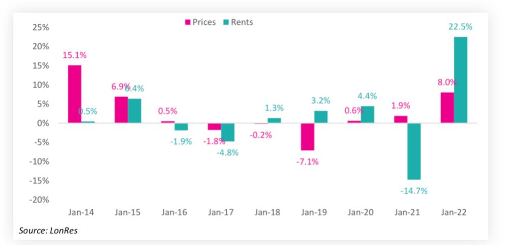 据统计,1月份,可供出租房屋库存下降了67%,这使得租金正在以22.5%的年增长率“飙升”。