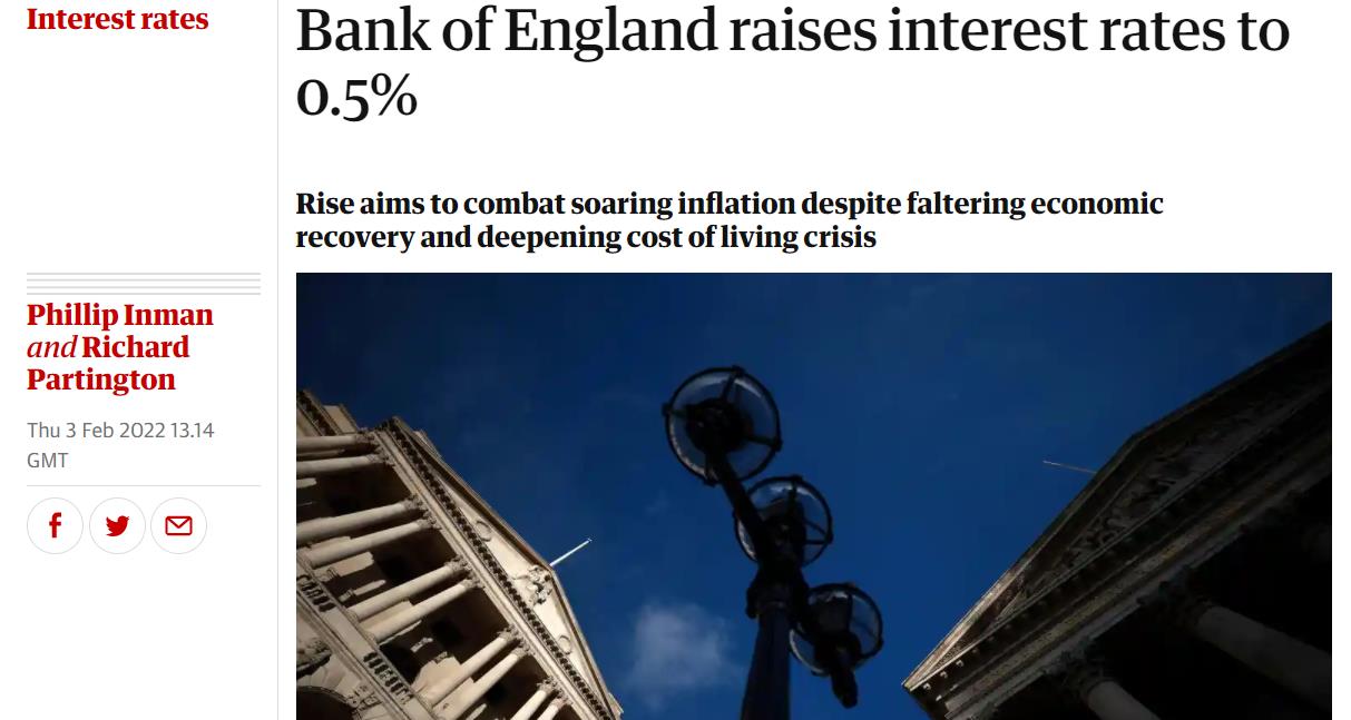 目前,英国央行已通过两次加息,将利率从0.1%的历史低点上调至0.5%。