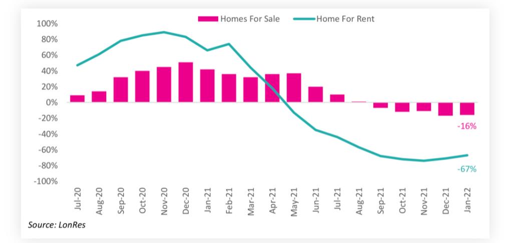 LonRes的数据显示,自2021年下半年以来,英国可供出售的房屋数量一直在减少,与去年同期相比,今年1月份市场上的可售房屋数量减少了16%。