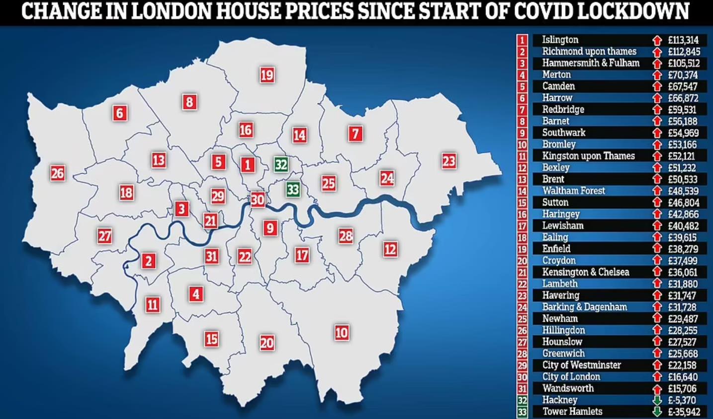 不仅如此,伦敦有13个行政区在疫情后的房价上涨超过了5万英镑,29个行政区的房价上涨超过2万英镑。