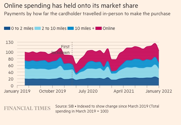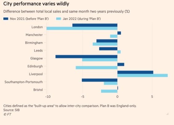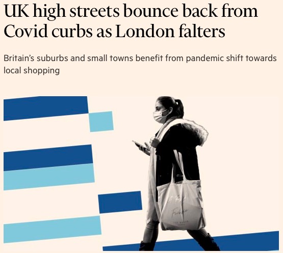 - 《金融时报》对消费者数据的一项分析显示:目前,英国绝大多数地区的商业街销售额都高于新冠疫情爆发之前!