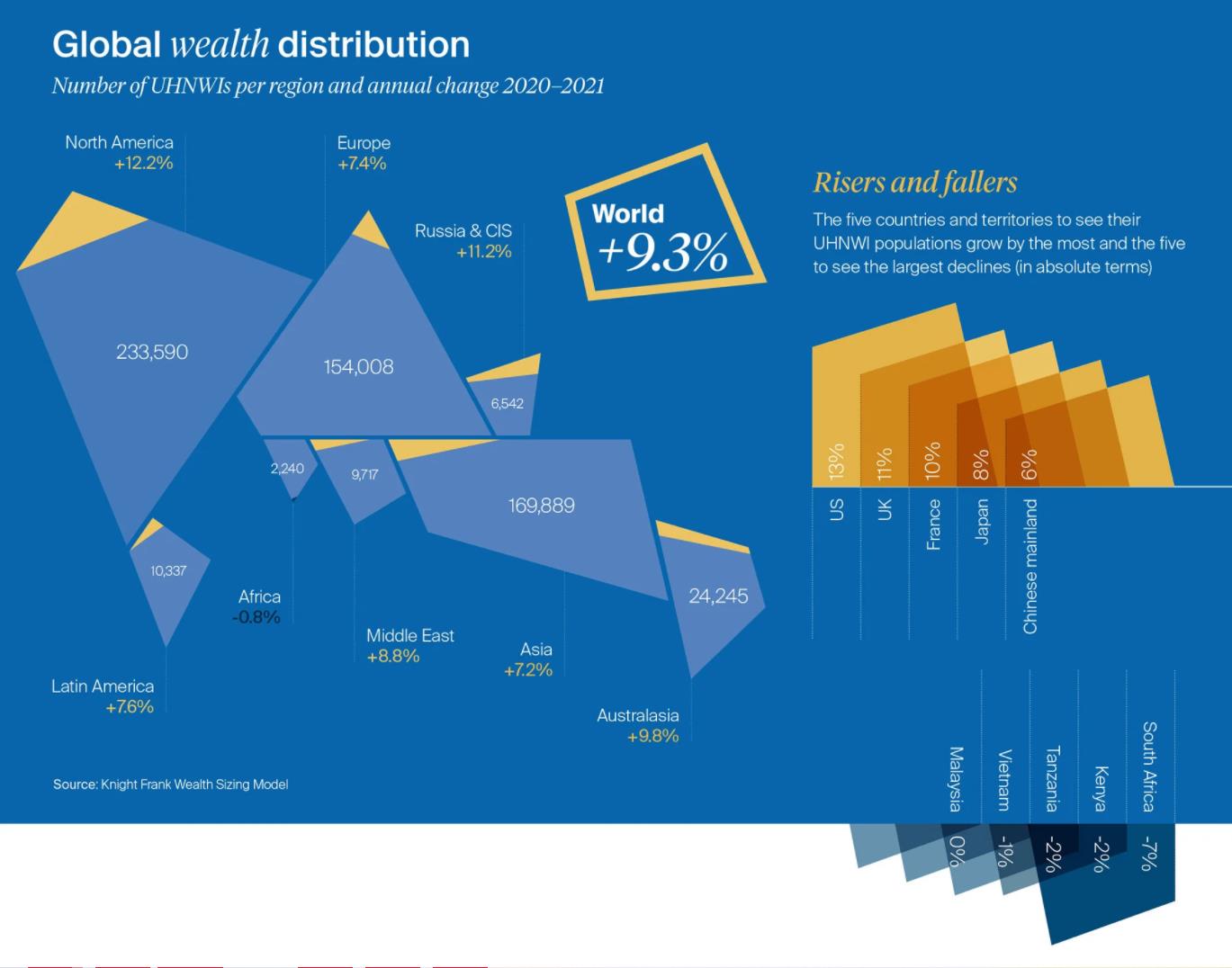 Knight Frank的数据分析显示,全球超高净值人士的数量在2020年增长2.4%之后,在2021年大幅增长了9.3%,新增了5.2万名非常富有的人,这使得超高净值人士数量增加至610,569人。