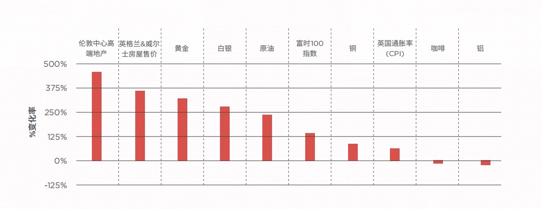 数据显示,在过去25年的时间里,伦敦核心区的高端房地产以458%的增值幅度稳占榜首,一般地产也以357%的增长幅度优于黄金和白银,大幅跑赢通胀。