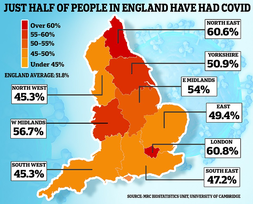 如下图所示:英国的新冠发病率(即被感染人口的比例),区域流行率从西北和西南地区的45.3%到伦敦的60.8%不等