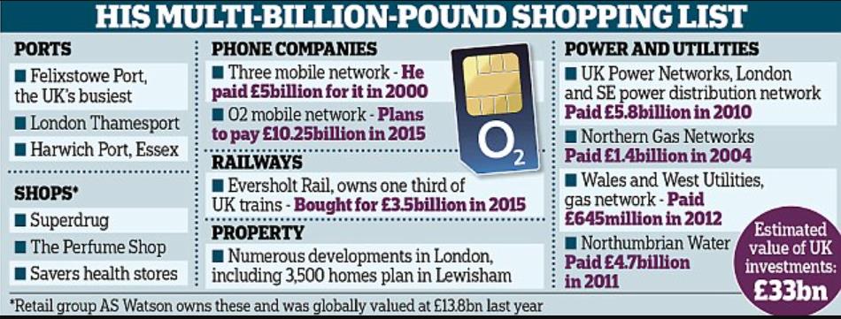 2000年,李嘉诚50亿收购英国电信公司“Three”。2015年,李氏集团再次斥资102.5亿英镑将英国移动运营商“O2”纳入囊中。