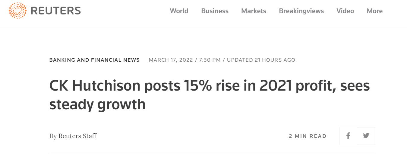 根据其发布的《2021年度业绩报告》,长和2021年的净利润增长15.1%至335亿港元(42.8亿美元),远超外界预期的326亿港元。