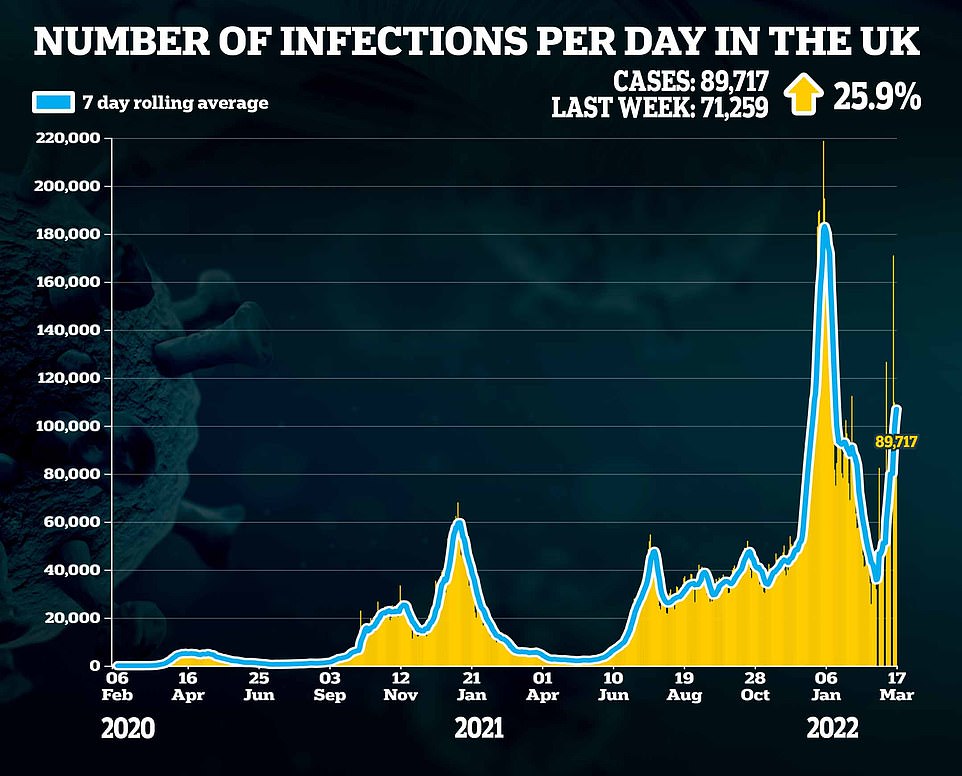 昨天,英国新增确诊89,717人,较上周同一时间上涨25.9%。这已经是连续第15天,新增感染人数相比上一周在增加。