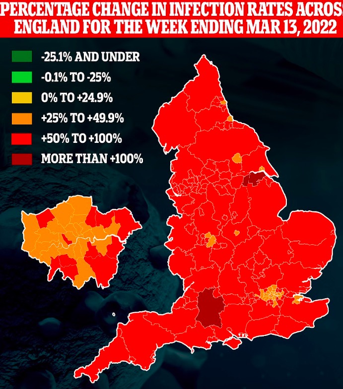 在BA.2毒株的驱动下,英格兰的每个行政区新冠感染人数都在上升。