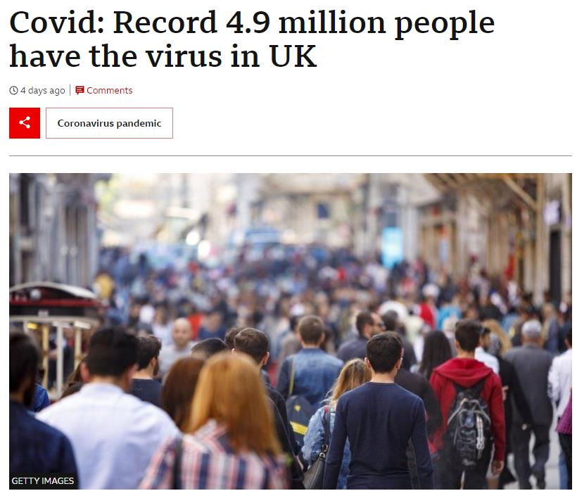 而且,根据英国国家统计局(ONS)的大型监测数据(根据数万人的随机检测得出),目前的感染水平依旧很高,英国每13人中就有1人感染了新冠病毒。