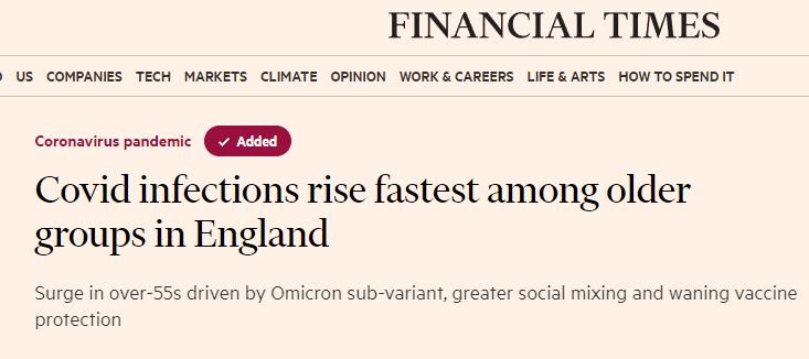 与此同时,尽管有迹象表明儿童和年轻人的感染可能已经达到顶峰,但截至上月底,55岁及以上人群的新冠病毒感染率达到了8.3%。