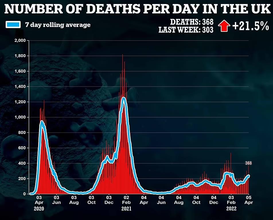本周二,英国新增死亡368人,同比上涨21.5%,这也是自2月初以来的最高单日死亡人数。