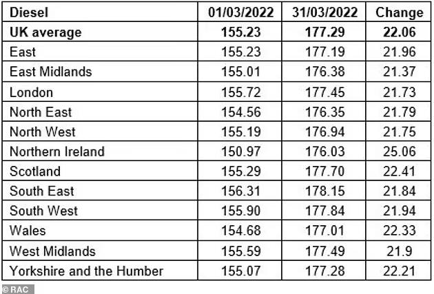 柴油价格涨幅更高,每升上涨22.1便士至177.3便士。