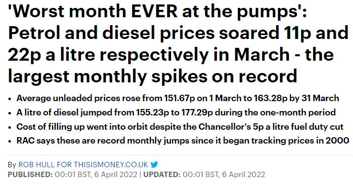 英国3月份的燃油价格创下了有记录以来的最大涨幅,一箱汽油平均成本同比上涨21.93英镑,柴油成本同比上涨12.13英镑…