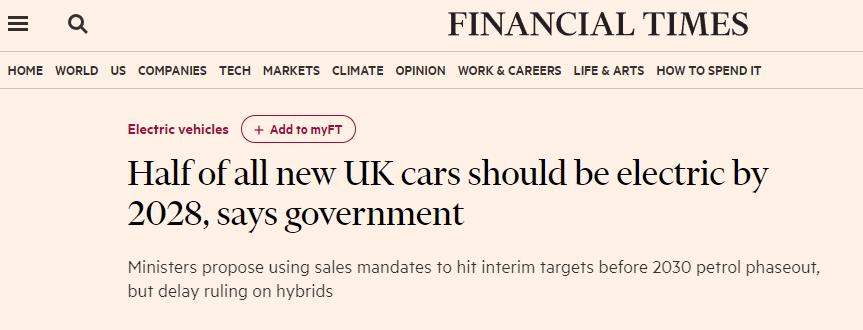 英国政府公布最新提案,截至2028年,英国销售的所有新车中有一半以上必须是纯电动的,将借鉴“中国模式”,要求电动汽车生产商逐年提高电动车销售份额…
