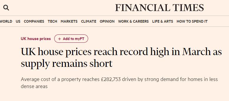 由于供不应求,3月份英国房价再创历史新高,环比上涨1.4%,同比上涨11%,比疫情前增涨了43,577英镑…