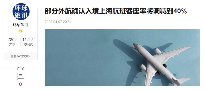 - 报道称,入境上海的国际航班客座率将由75%阶段性调减至40%,同时,近期已有多家外航对上海入境航班做出了相应调整…