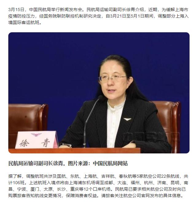 此前,中国民航局表示,将自3月21日至5月1日期间,调整部分上海入境国际客运航班。涉及航空公司包括国航、东航、上海航空、吉祥航空、春秋航空。