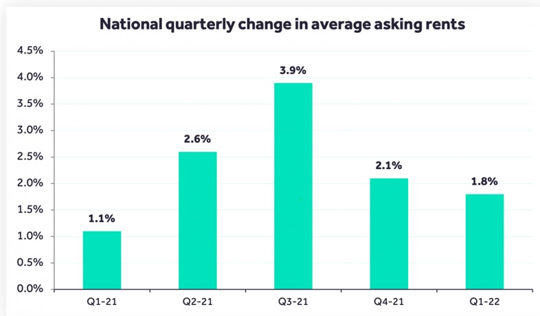 从全国范围来看,租赁市场正受到供需失衡加剧的影响。2022年第一季度可供出租的房产数量比疫情前五年的平均水平低了三分之一以上。与此同时,来自租户的需求持续上升。