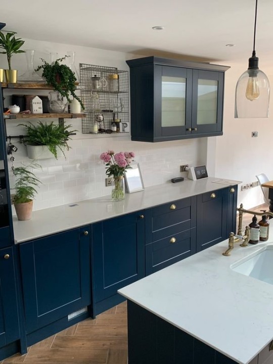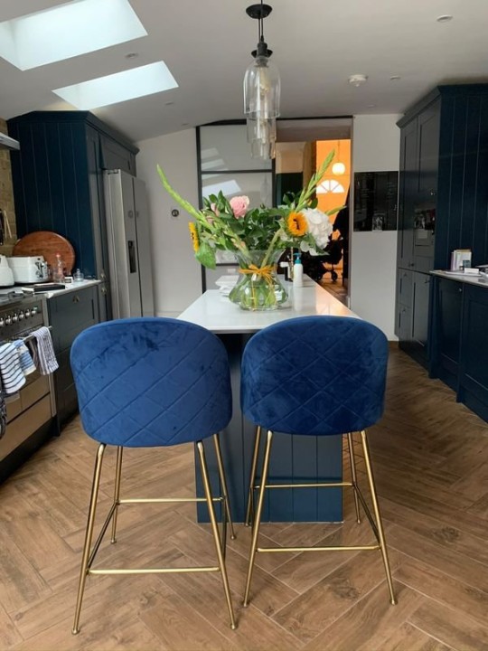 厨房的中岛,天鹅绒的座椅增加了高级感