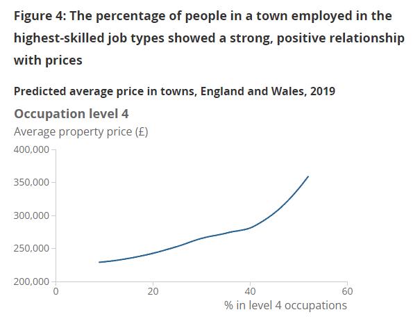 也就是说,从事4级技能工作的居民比例每上涨10%,房价就会上涨约2万英镑。而且,在高技能居民比例最高的城镇中,这种影响得到了进一步加强。
