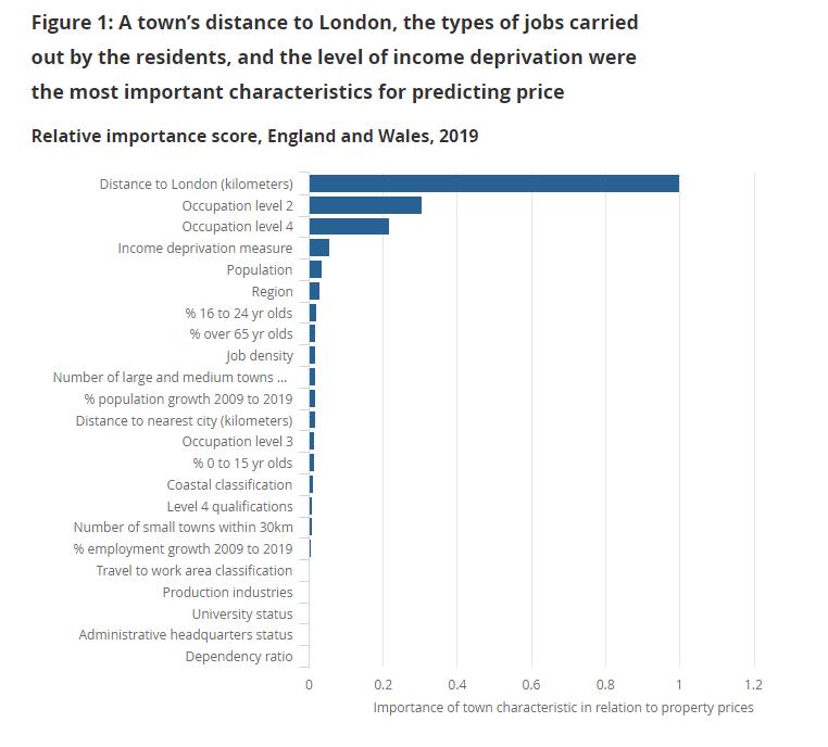 最终,根据ONS的分析,排名第一的因素是家与伦敦的距离,其次是居民从事的工作类型,以及城镇的收入匮乏程度(income deprivation)。