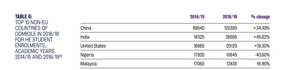 这其中,中国留学生的数量更是出现了显著增加,已经从2006/2007年度的2.5万人增加到2018/2019年度的12万人,占到非欧盟学生总数的35%,几乎是印度的5倍。