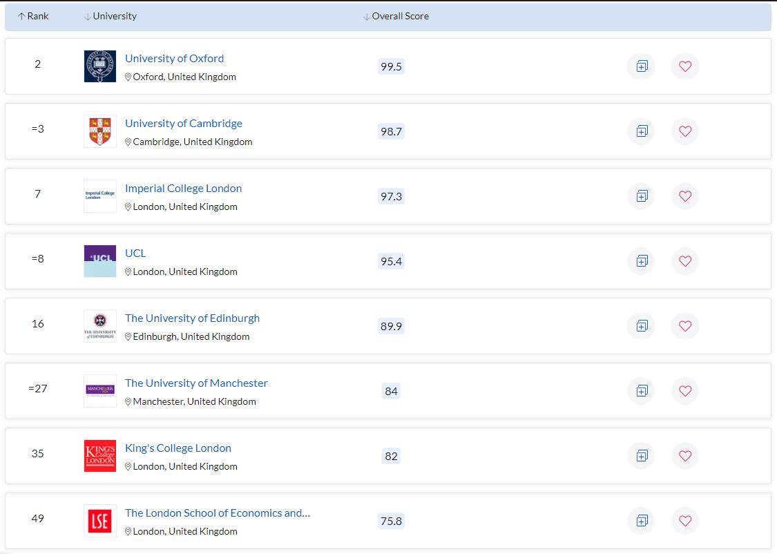 除了大家耳熟能详的牛剑外,在前50所高校中,伦敦就占据了4所,分别是帝国理工学院(排名12),伦敦大学学院(排名18),伦敦政经学院(排名27),伦敦国王学院(排名35)。