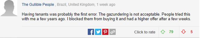 还有网友指出把房子租出去是第一个错误,并对“gazundering”行为发表了自己的看法–“gazundering”是完全无法接受的,我几年前遇到过这种情况,但我并没有卖给他们,并在几周后获得了更高的报价。