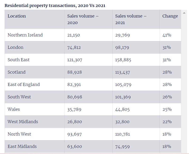 从房产交易量增长率来看,北爱尔兰2021年的房产交易量同比增长41%,位居第一。伦敦和英格兰东南部并列第二,交易量同比增长31%。