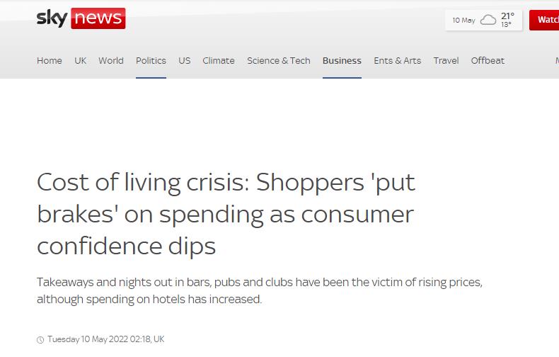 行业数据显示,飙升的生活成本致使购物者改变了消费习惯,英国4月份零售额出现小幅下滑…