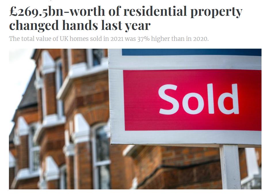 研究发现,2021年在房价暴涨和25%的年交易量增长率的推动下,英国的住宅销售总值高达2,695亿英镑,较2020年增加了37%…
