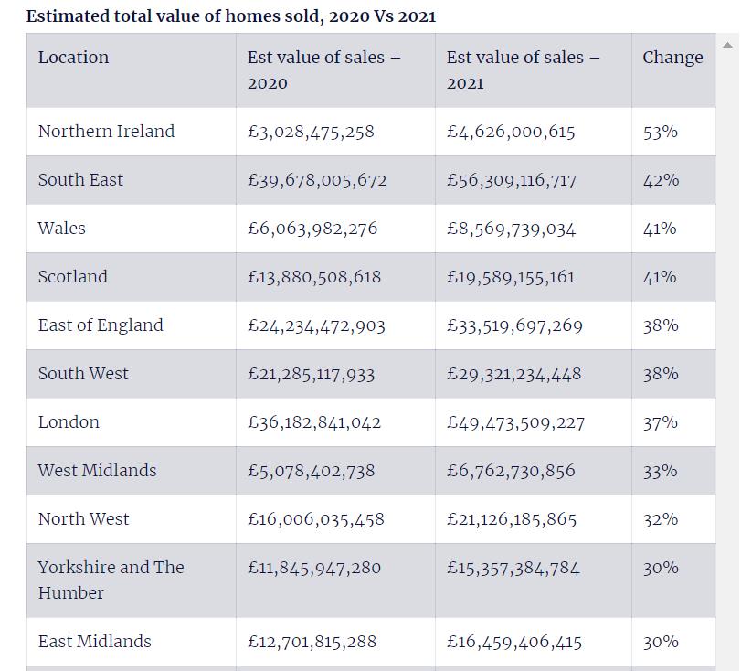 Boomin的研究显示,由于房价暴涨,加上年交易量大幅增长25%,2021年英国的住宅销售总值高达2,695亿英镑,较2020年增加了37%。