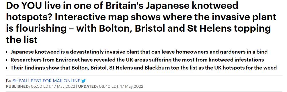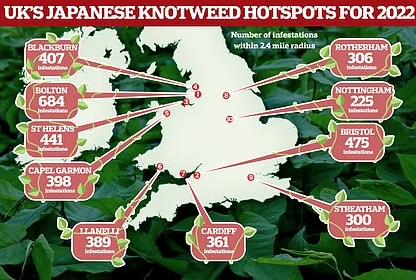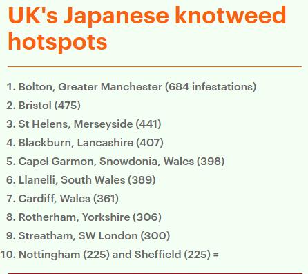 Environet公布英国“房产隐形杀手”日本虎杖的分布图,博尔顿(Bolton)、布里斯托尔(Bristol)、圣海伦斯(St Helens)和布莱克本(Blackburn)是受影响最大地区…