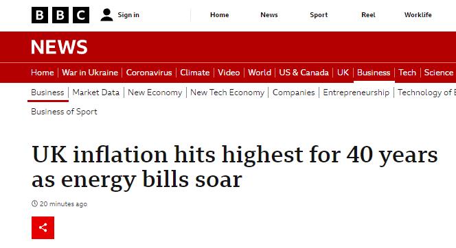 今年4月份,英国通胀率CPI从3月份的7%跃升至9%,为1982年以来的最高水平。