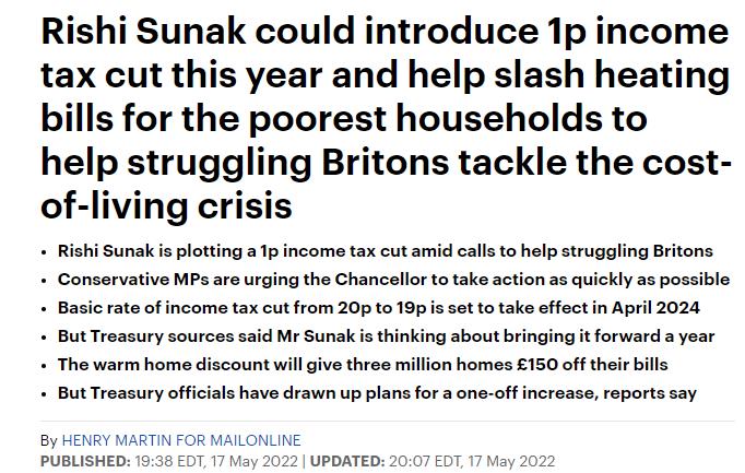 此外,从20便士降至19便士的基本所得税税率将于2024年4月生效,但财政部消息人士表示,苏纳克正在考虑将其提前一年,并在秋季的预算会议上宣布。