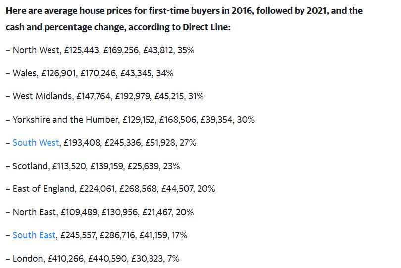 其中,英格兰西北部是首次购房者房产价格涨幅最大的地区,截至2021年的五年内上涨了35%(43,812英镑)。