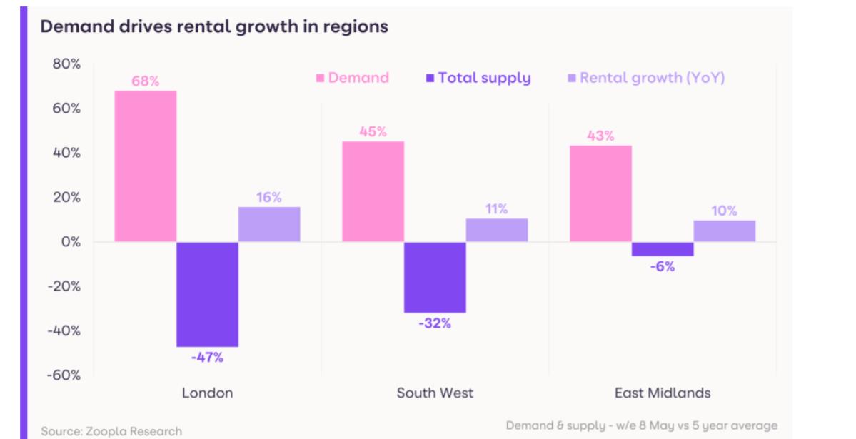 Zoopla表示,租金的持续上涨来源于供应和需求的极度不平衡,伦敦供不应求的现象更为严重。据悉,与五年期平均水平相比,伦敦租赁需求增长了68%,但供应却下降了47%。