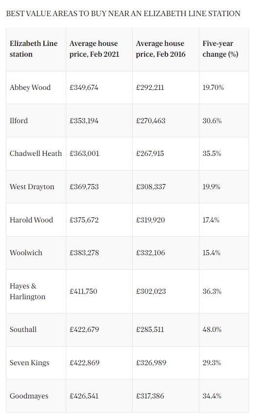与此同时,来自Rightmove的数据也显示,在过去10年里,伊丽莎白线一些车站附近的要价增长了一倍多。
