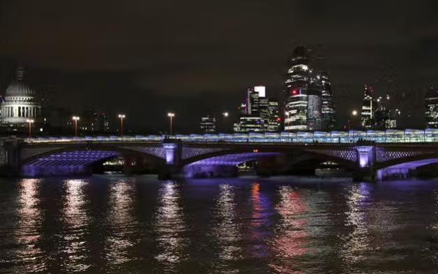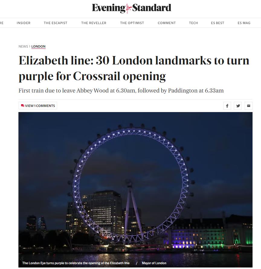 不仅乘客们为之疯狂,为了纪念这一历史性的时刻,伦敦约30个地标建筑,包括伦敦眼、伦敦塔桥、金丝雀码头的小黄瓜、奶酪刨等摩天大楼都亮起了紫灯,氛围感十足。