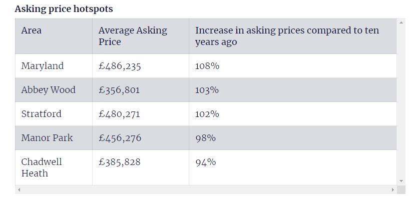 具体来看,位于纽汉姆(Newham)的Maryland车站附近的房屋要价涨幅最大,与10年前相比上涨了108%,从233,480英镑增至486,235英镑。相比之下,伦敦过去10年的平均增幅为55%。