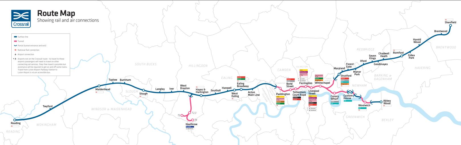 这条线路西起雷丁(Reading)和希斯罗(Heathrow),穿过伦敦市中心,东至申菲尔德(Shenfield)和阿比伍德(AbbeyWood),全长118公里,建成后沿线将有41个站点。