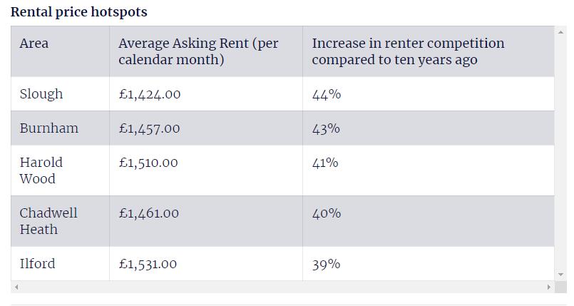 在租房市场,位于西部的车站Slough的租金要价涨幅最大,比10年前增长了44%。