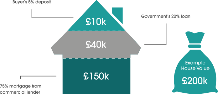 房屋价值 £200K,买家首付 £10K,Help to buy贷款 £40K,银行贷款 £150K