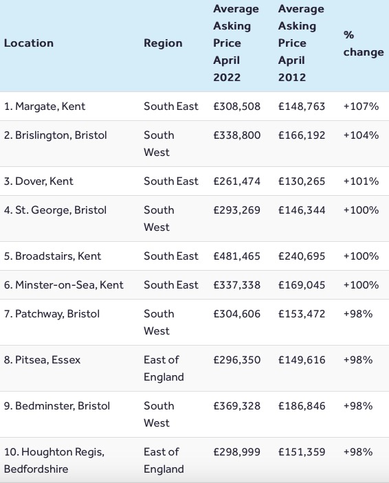 过去10年来,英国房价涨幅最大的10个地区揭晓,肯特郡是最大赢家,4个地区的房价10年涨幅最大:分别是Margate, Dover, Broadstairs和Minster-on-Sea,平均房价翻了一番。