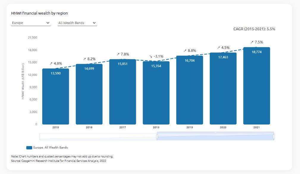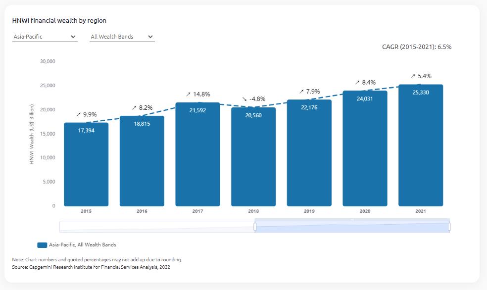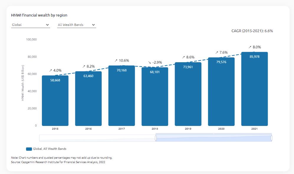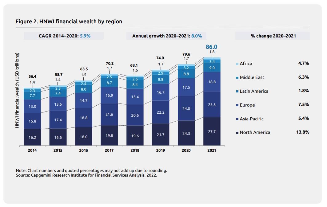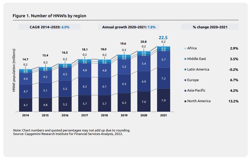凯捷在报告中指出,各国政府史无前例的经济刺激计划、低利率的环境、疫情后流动性的增加、股市上涨和广泛的新冠疫苗接种,推动了2021年全球经济的快速恢复,并加速了高净值人士(HNWI) 的数量和财富的增长。