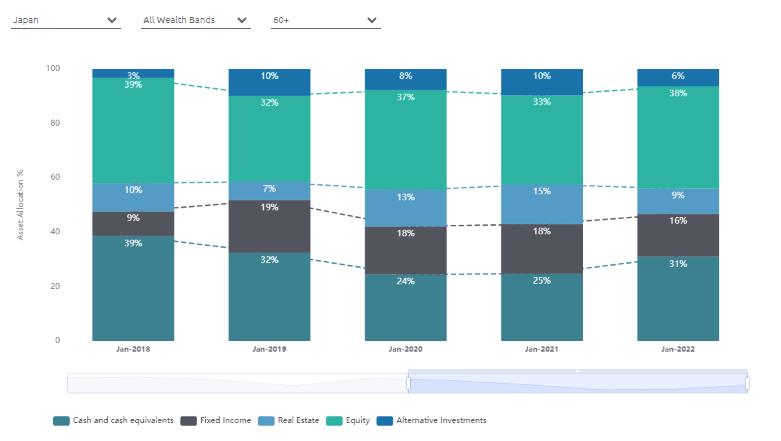 而在日本,高净值人士在现⾦和现⾦等价物方面的投资显著增加。