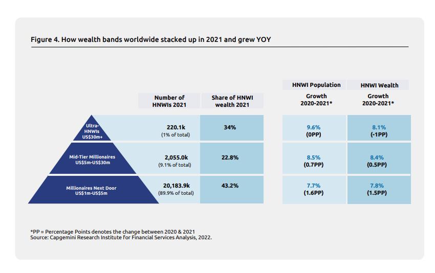 对高净值人士进行细分后发现,超高净值⼈⼠(Ultra-HNWIs)仍然是2021年财富增⻓最快的群体。