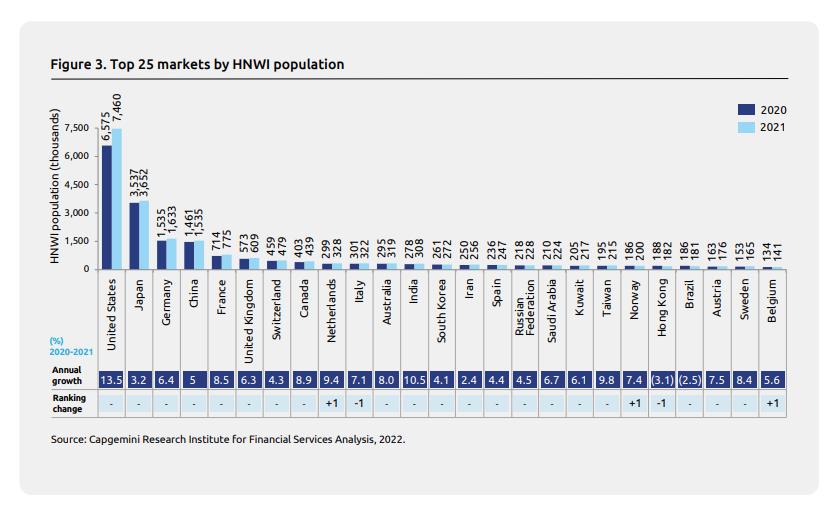 数据显示,2021年,全球高净值人士数量较2020年同比增长7.8%,总数达到2,245万人,新增富裕人士170万。